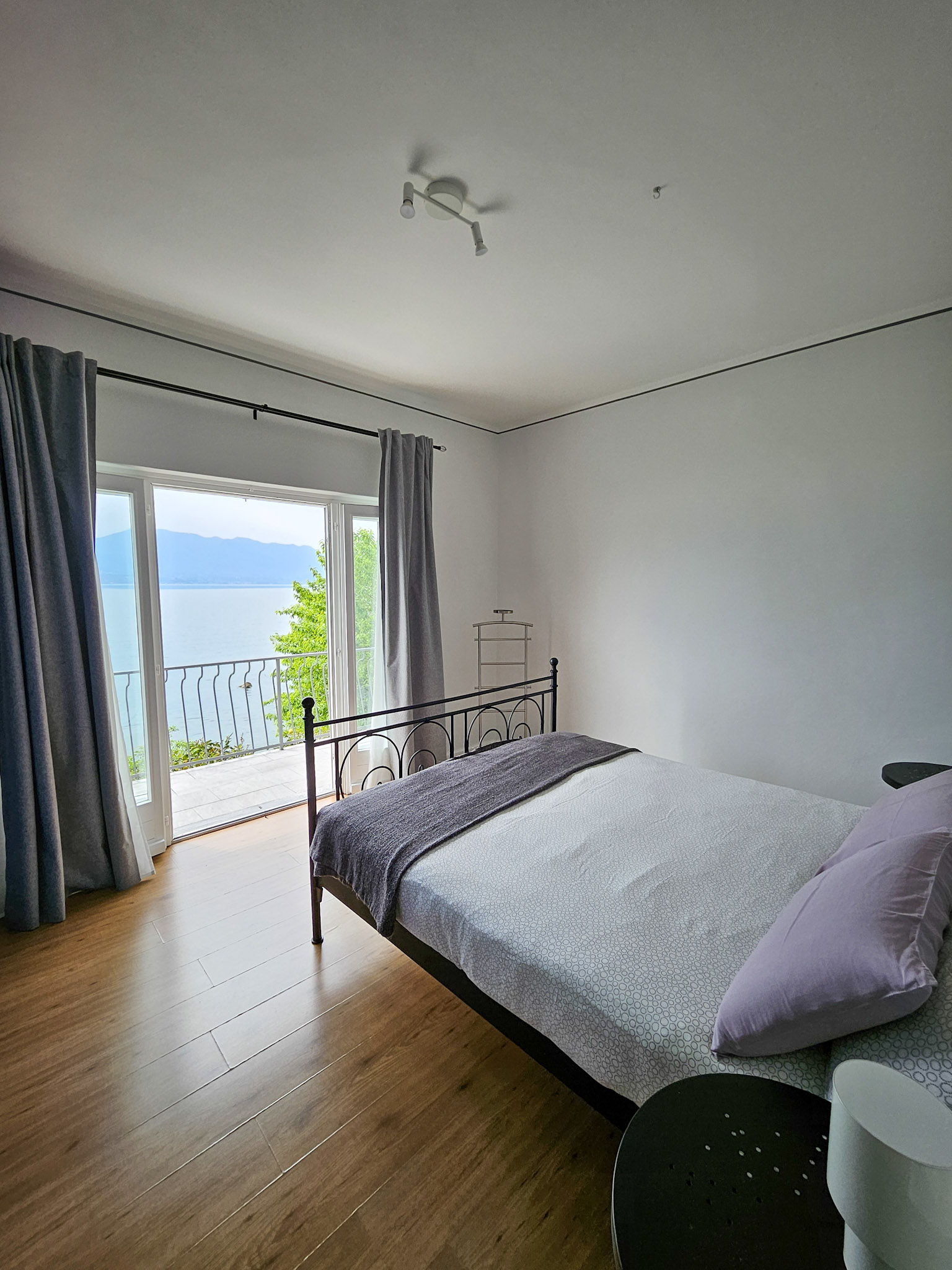 - Schlafzimmer mit Doppelbett (einzelne Matratzen) sowie atemberaubender Sicht auf den See, die Schlösser von Cannero und das gegenüberliegende Ufer sowie Ausgang auf den Balkon
