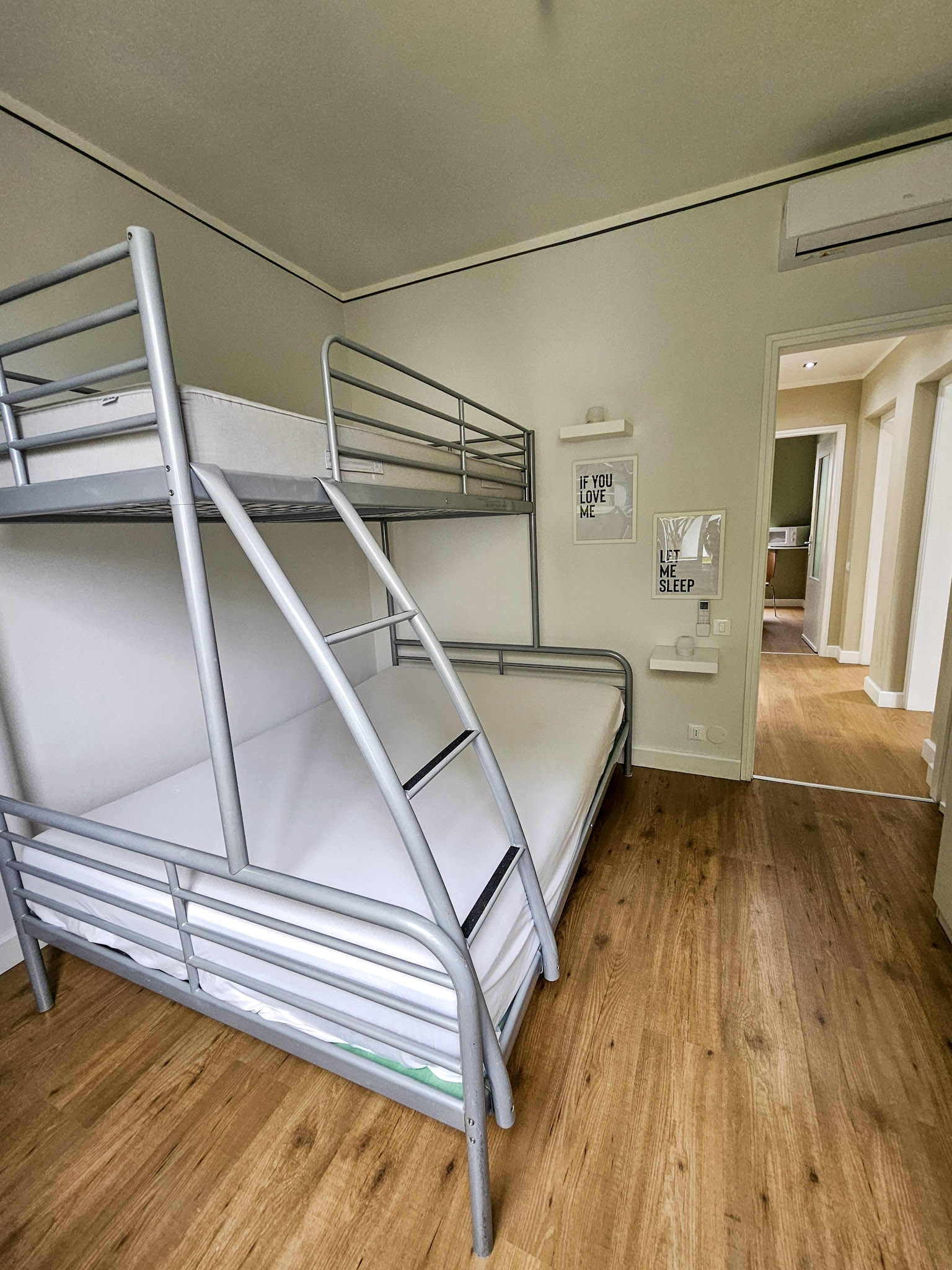 - 2. Schlafzimmer mit Kombinationsetagenbett für 3 Personen (untere Ebene: Doppelbett mit durchgehender Matratze, obere Ebene: Einzelbett) sowie seitlicher Seesicht