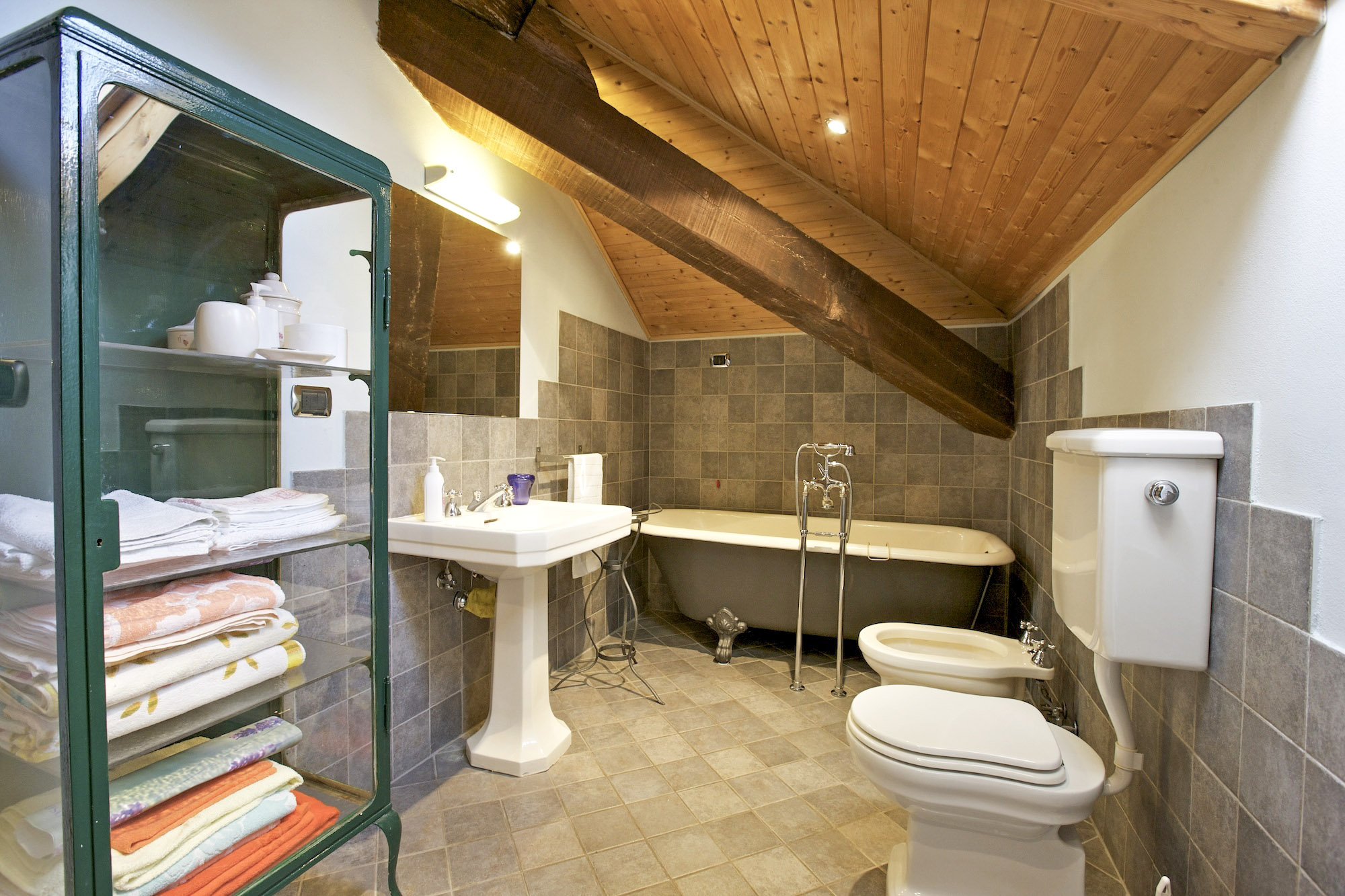 - Wunderschönes, antikes Badezimmer mit gusseiserner Badewanne, Bidet und Fenster