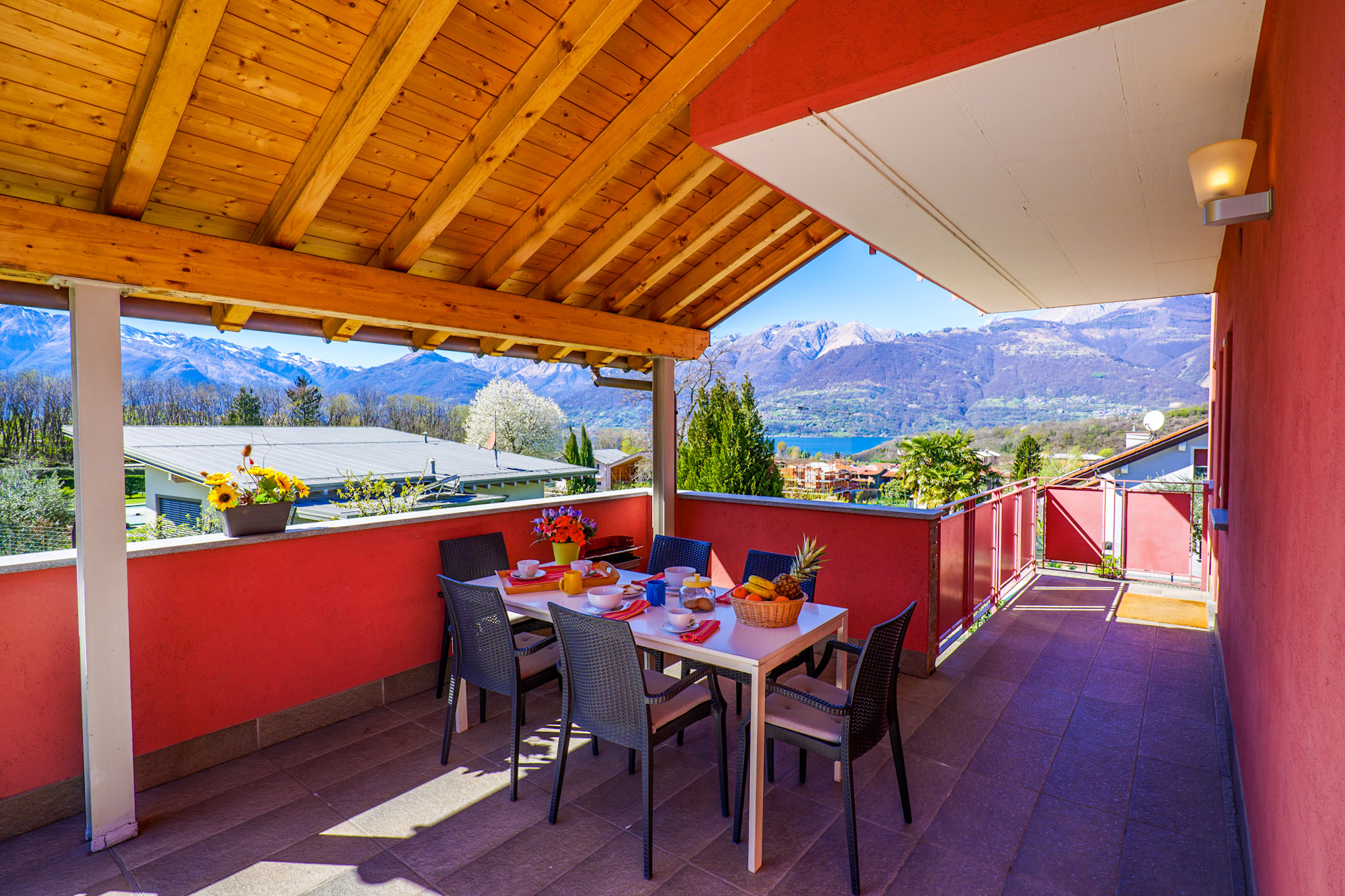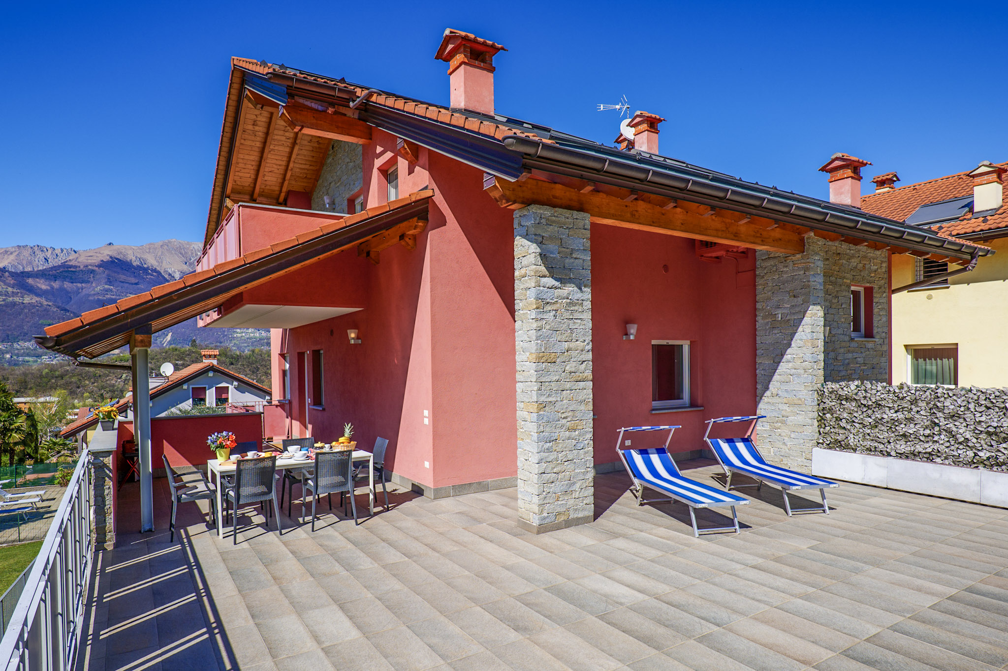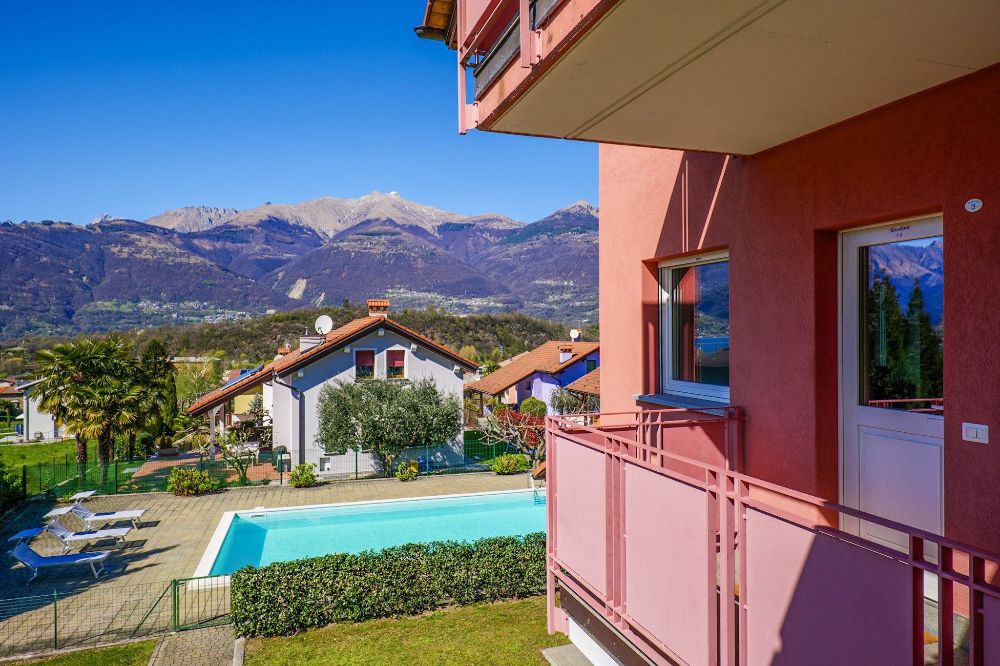 Die beiden Ferienhäuser liegen direkt nebeneinander in idyllischer Hanglage. Ihren Namen verdanken die einzelnen Wohnungen dem Hobby des Vermieters: er ist ein absoluter Rosenliebhaber. Im „Casa delle Rose Gialla“ stehen Ihnen zwei Wohneinheiten zur Anmietung zur Verfügung, im „Casa delle Rose Rossa“ sind drei. Jedes der geschmackvoll möblierten Appartements hat eine Terrasse oder einen Balkon, jeweils mit Grillmöglichkeit. Der solarbeheizte, unterwasserbeleuchtete Pool (10 m x 5 m) ist witterungsbedingt von ca. Ostern bis ca. Anfang Oktober geöffnet. Für die Kleinen stehen eine Rutsche, Schaukel und ein Sandkasten zur Verfügung. Der Pool und der Gemeinschaftsgarten werden von den Gästen beider Häuser genutzt. Eine Waschmaschine für alle befindet sich im separaten Waschraum der „Casa Gialla“. Der Yachthafen und die Ortsmitte des lebhaften Städtchens Colico sind zu Fuß in wenigen Minuten erreichbar. Ihren PKW parken Sie auf den privaten Abstellplätzen innerhalb des Grundstücks. Haustiere sind nicht erlaubt.