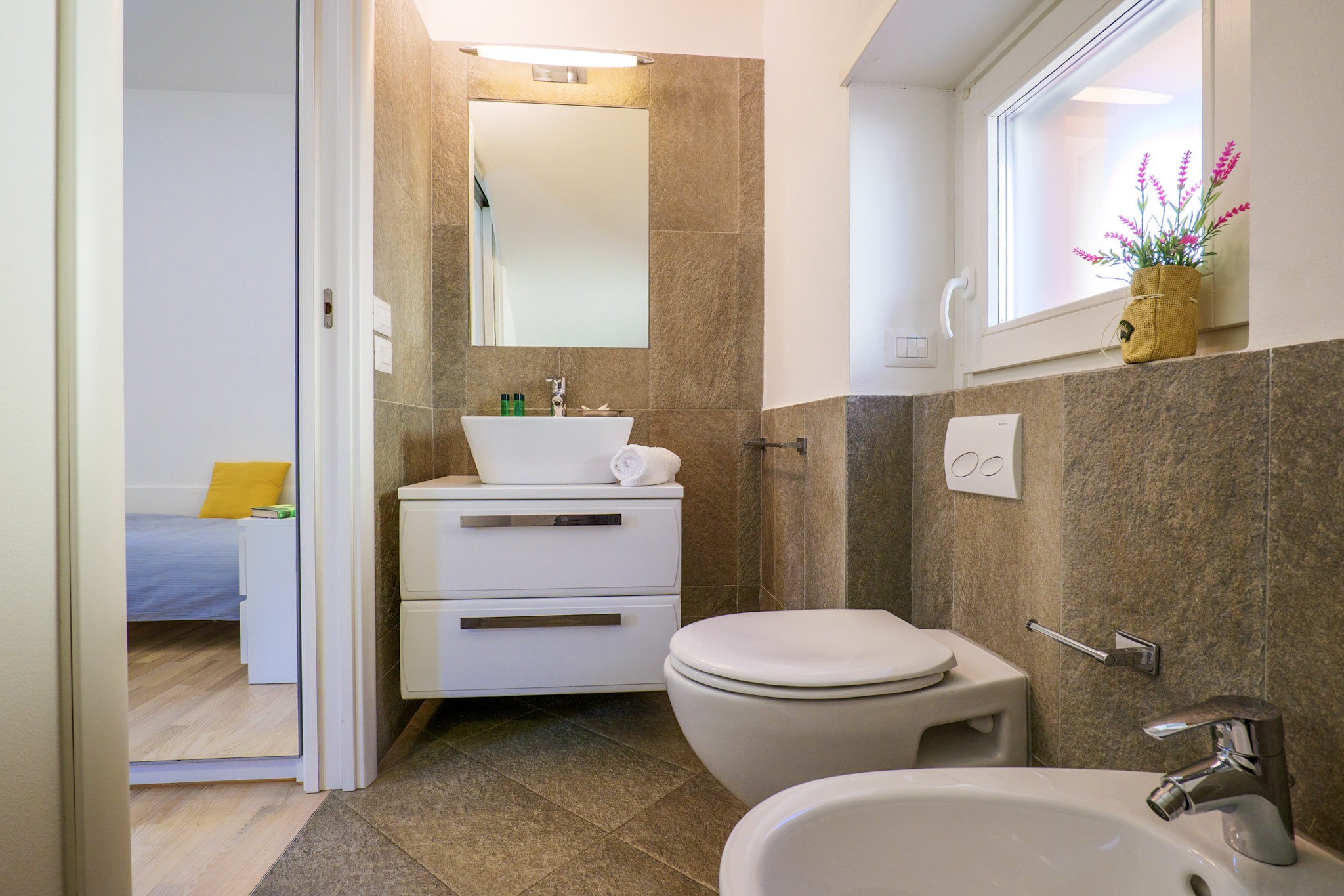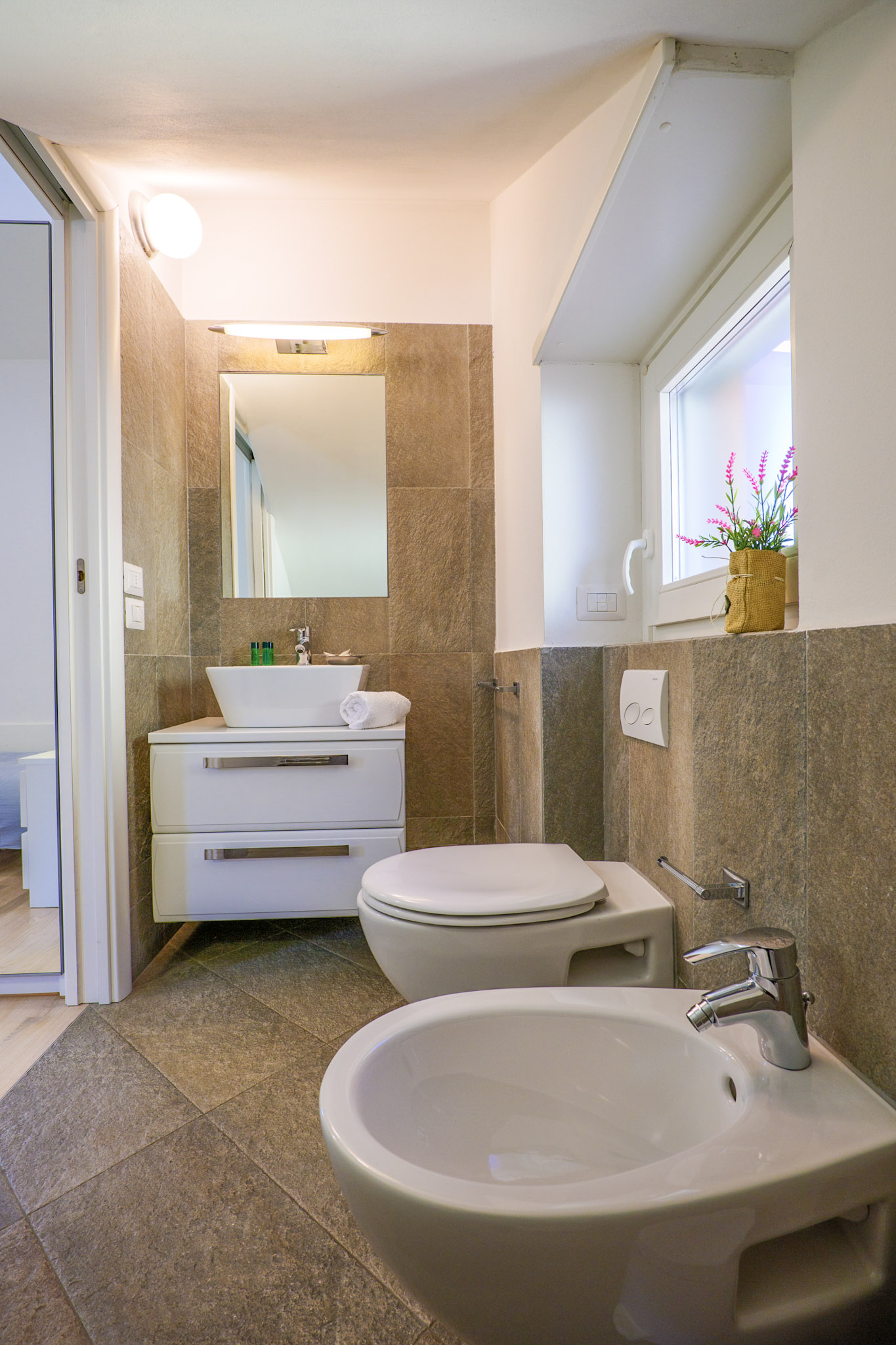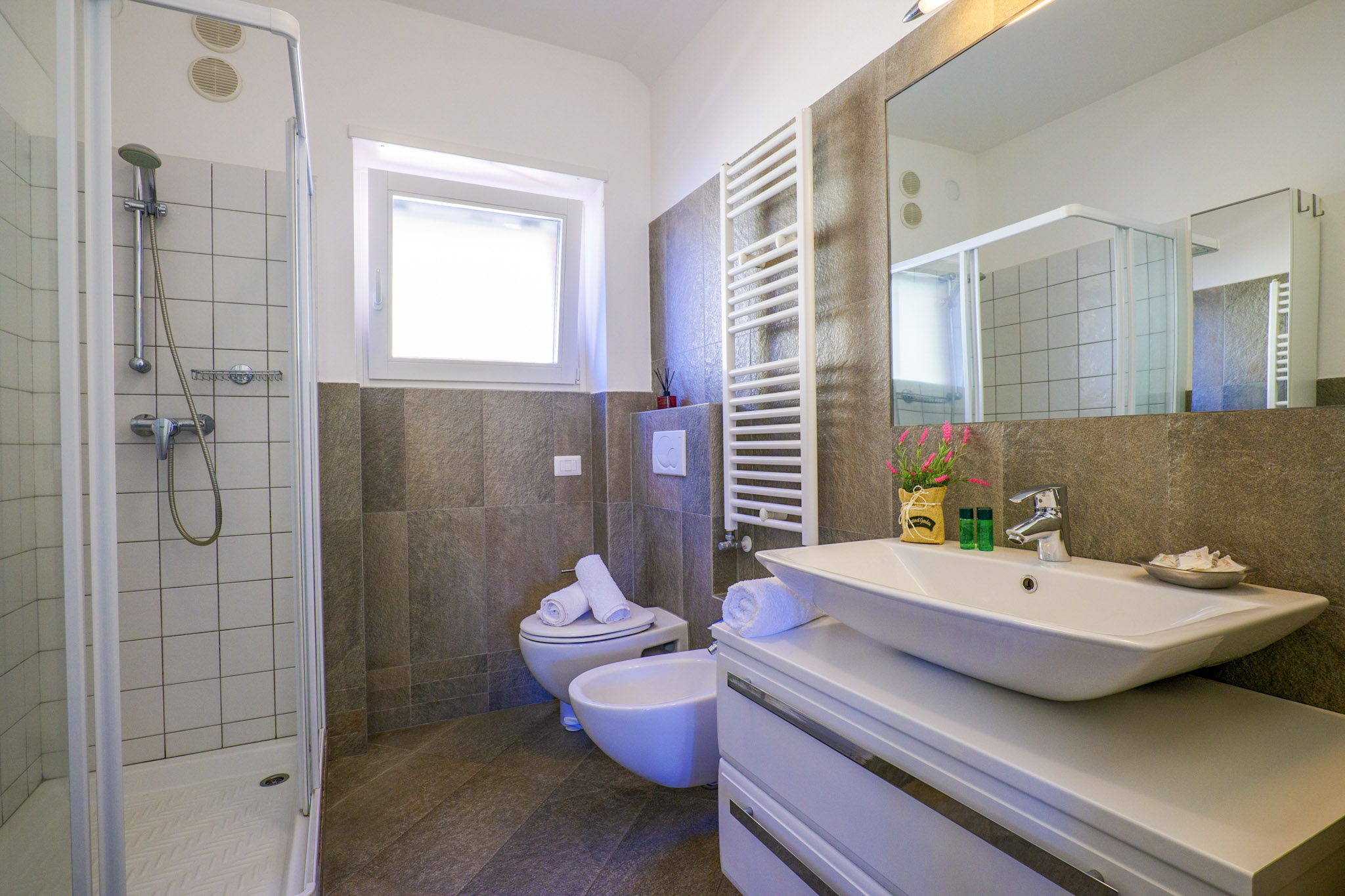 - Badezimmer mit Dusche, Bidet und Fenster