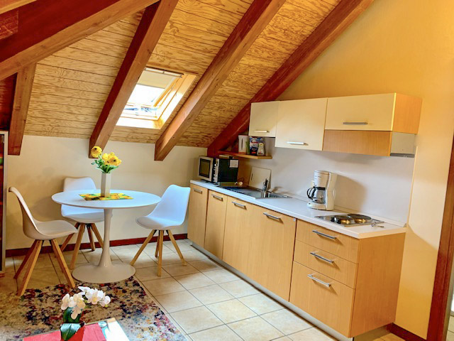- Gut ausgestattete Küchenzeile mit Geschirrspülmaschine, 2-Plattenherd, Mikrowelle, Toaster und Wasserkocher