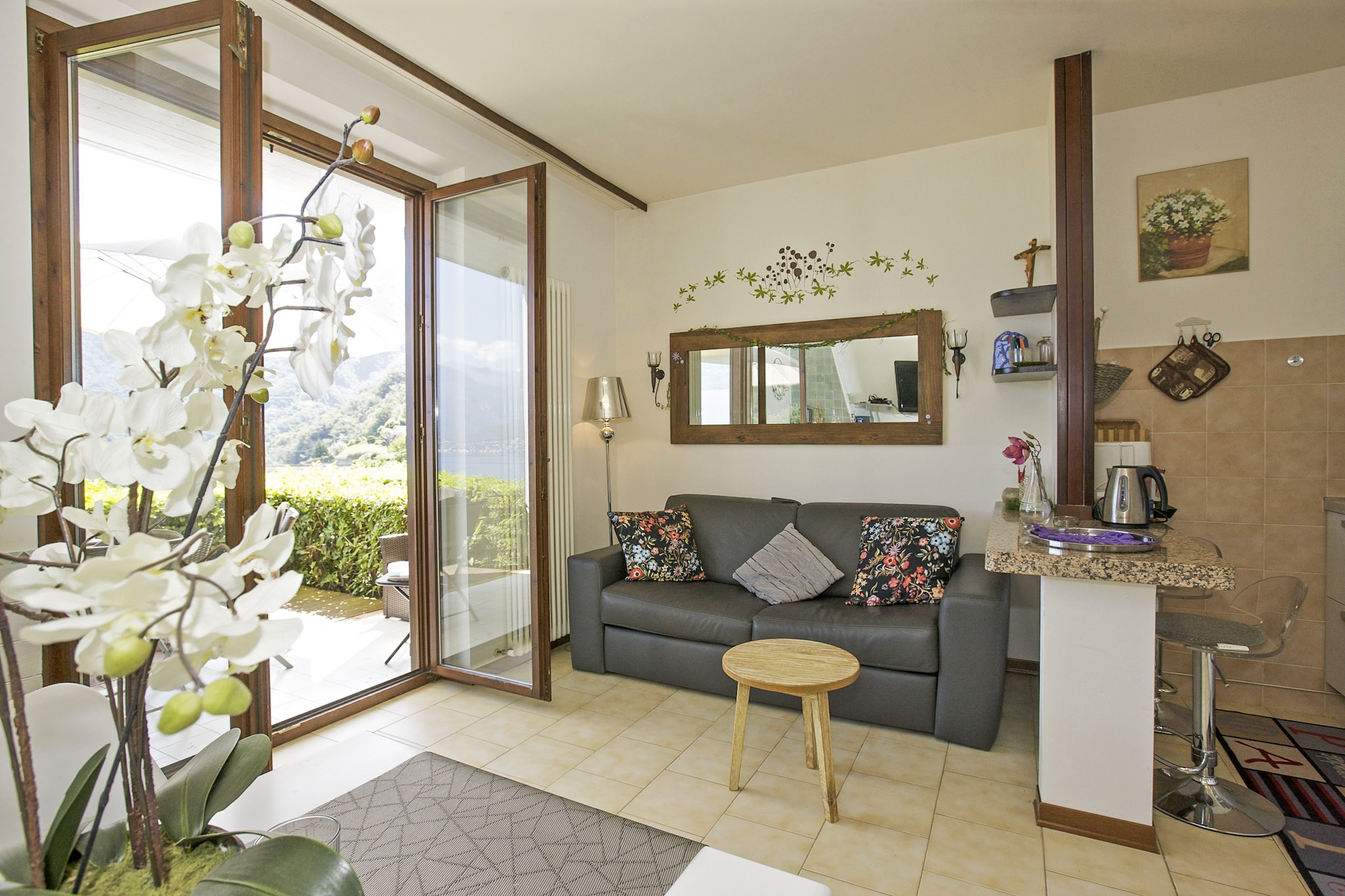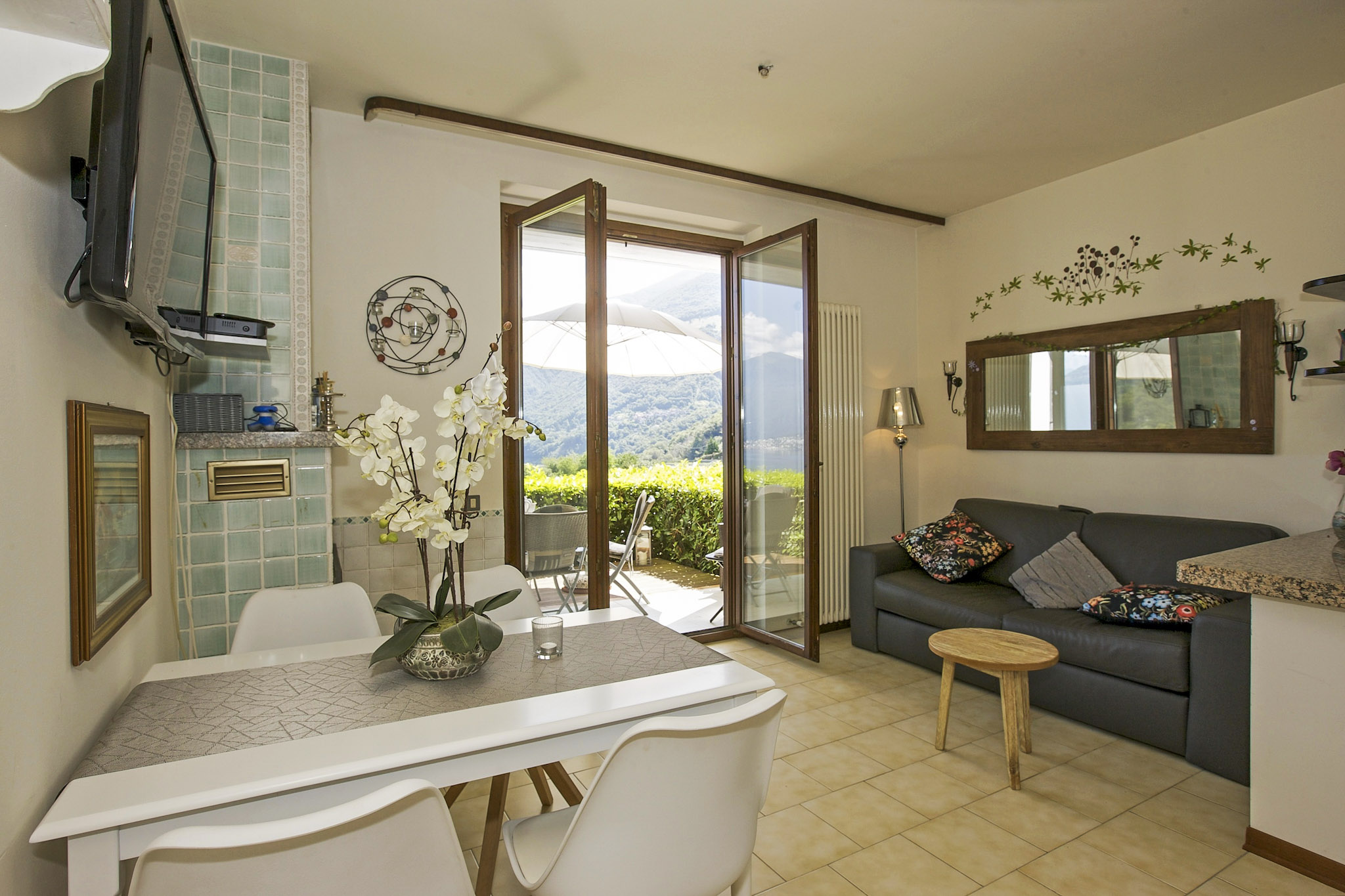 - Wohn-/ Esszimmer mit ausziehbarer Schlafcouch für 2 Personen (1,60 m x 2,00 m), Kamin (nur zur Dekoration), SAT-TV, fantastischer See-, Insel- und Alpensicht sowie Ausgang auf die 2. Terrasse