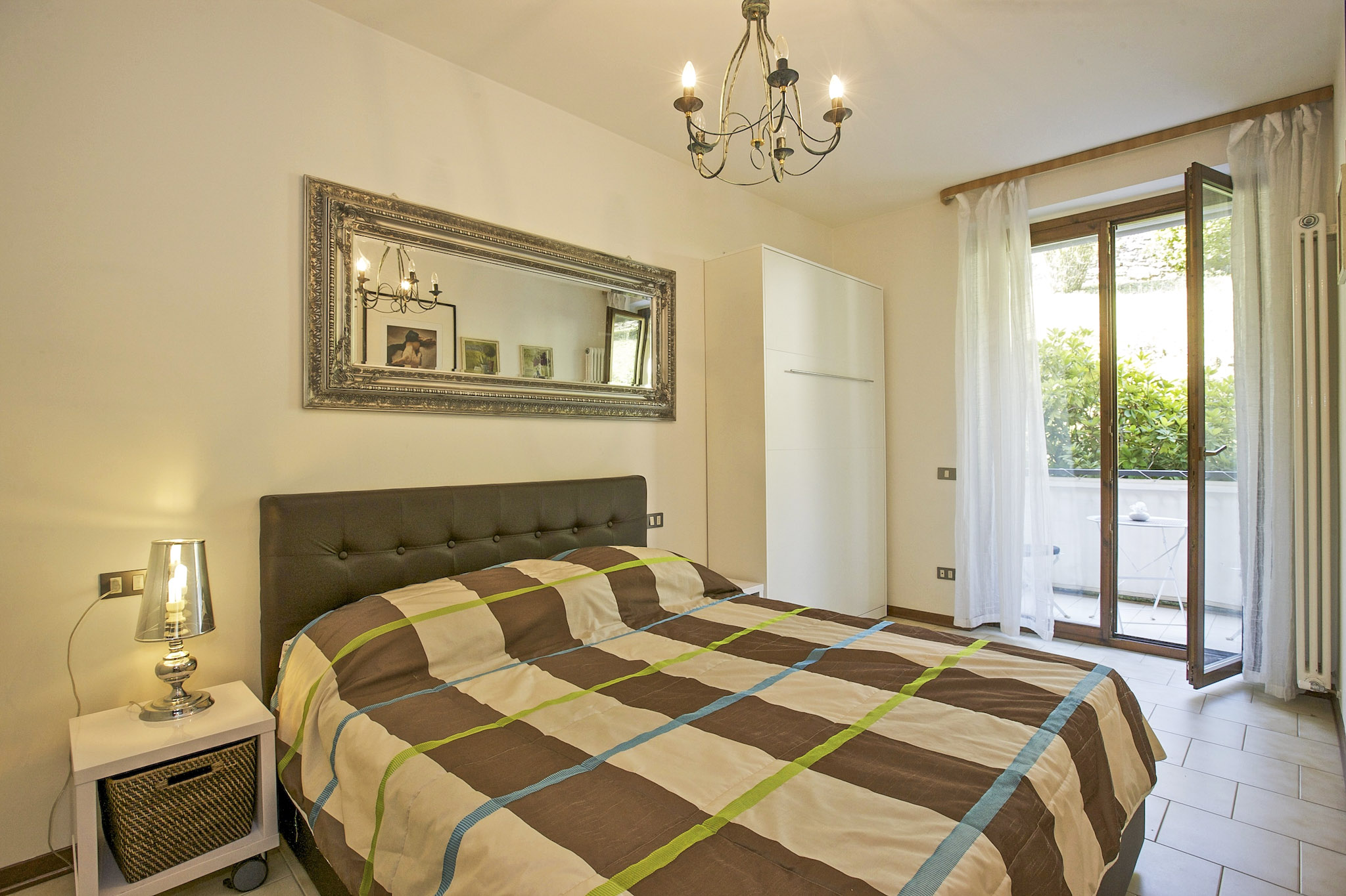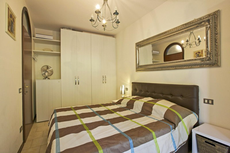 - Schlafzimmer mit Doppelbett (einzelne Matratzen 0,80 m x 2,00 m), Schrankbett (1,40 m x 2.00 m) und Ausgang auf die 1. Terrasse