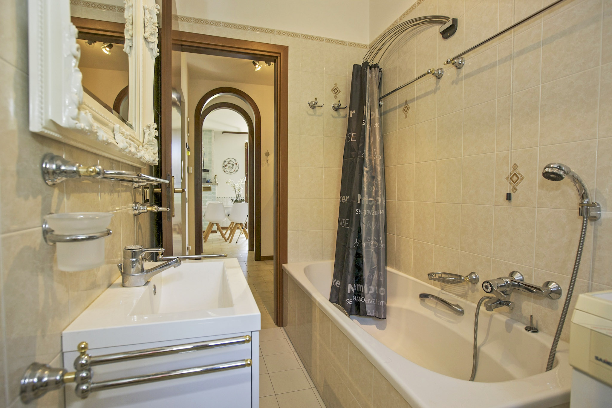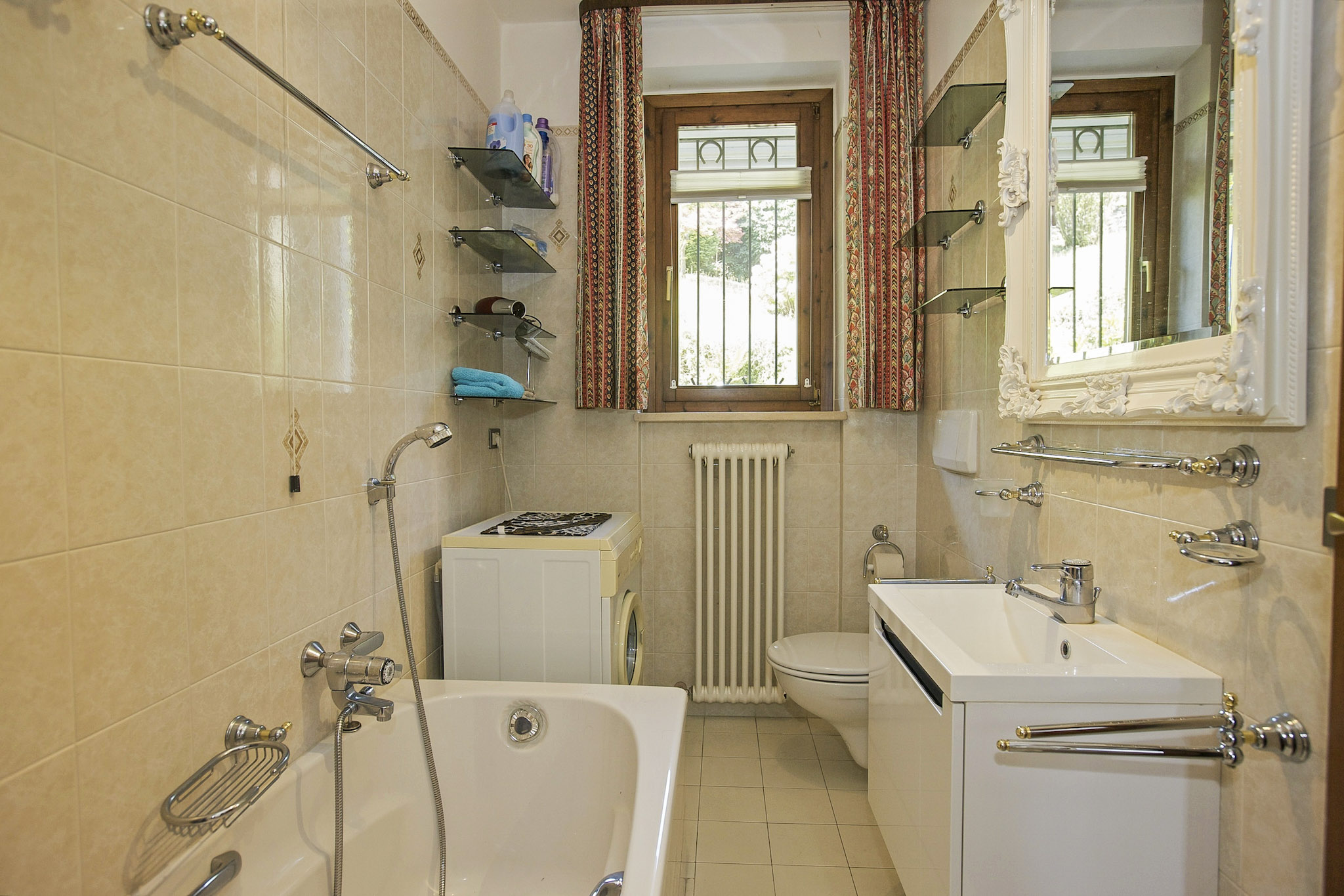 - Freundliches Badezimmer mit Badewanne mit Duschmöglichkeit, Waschmaschine und Fenster