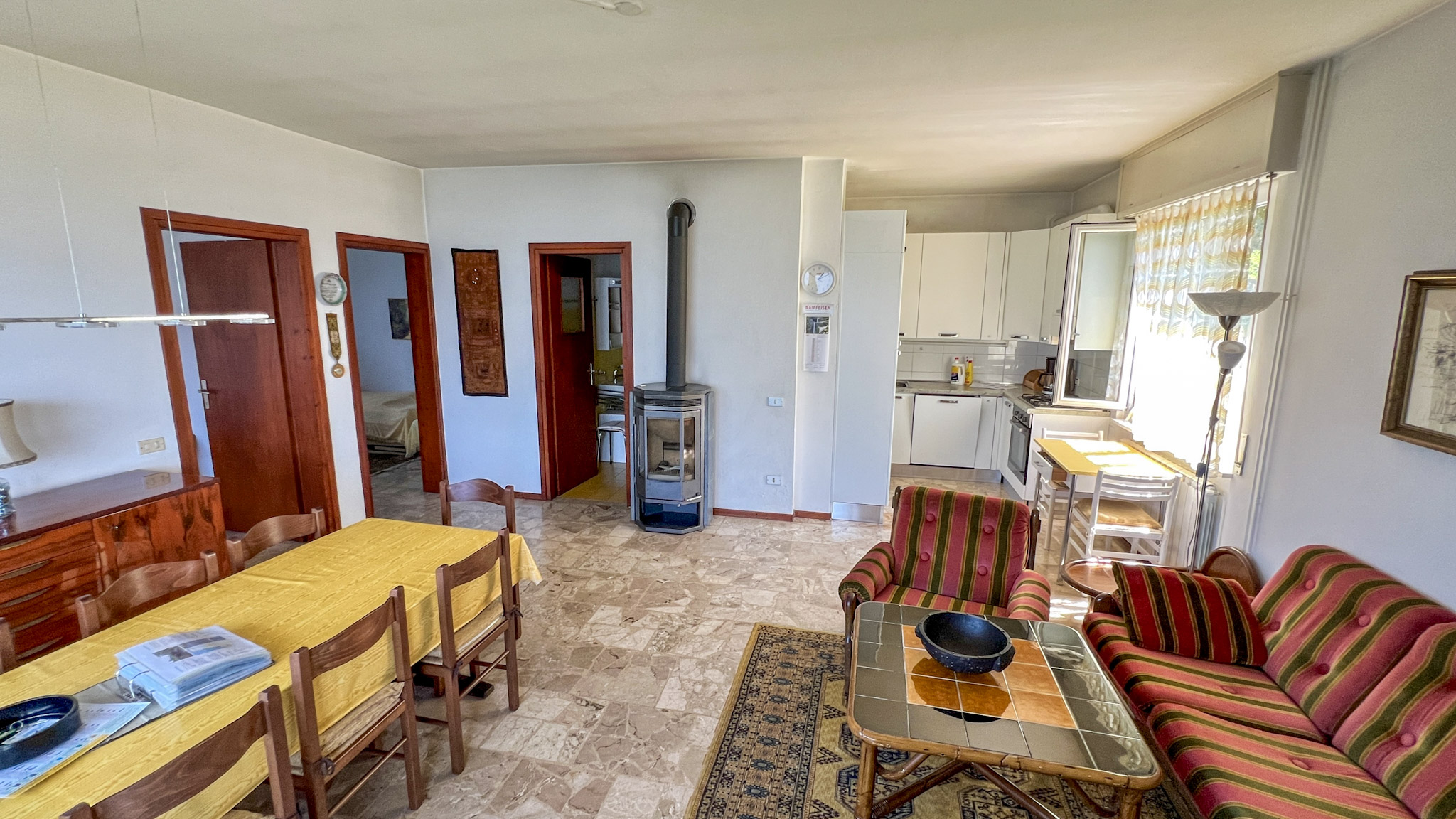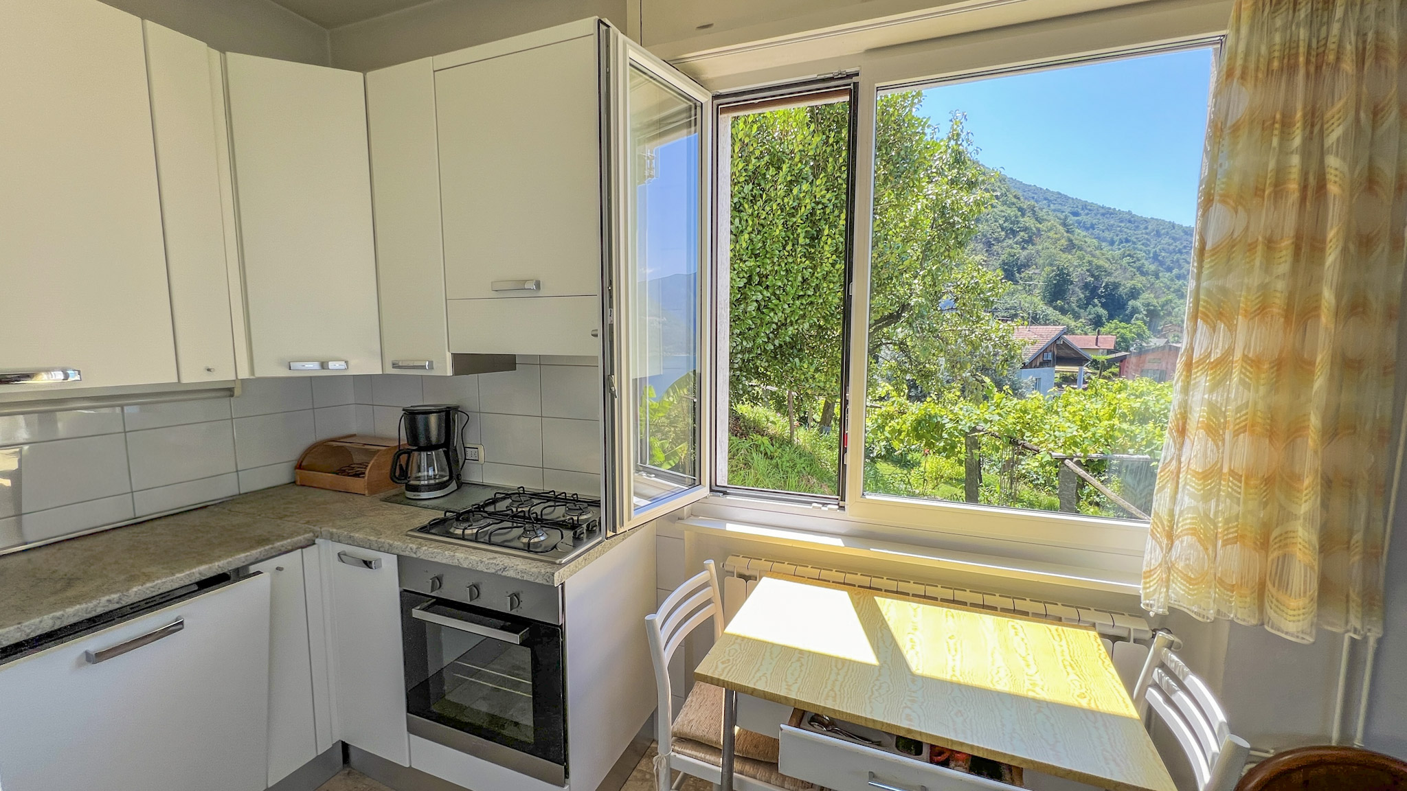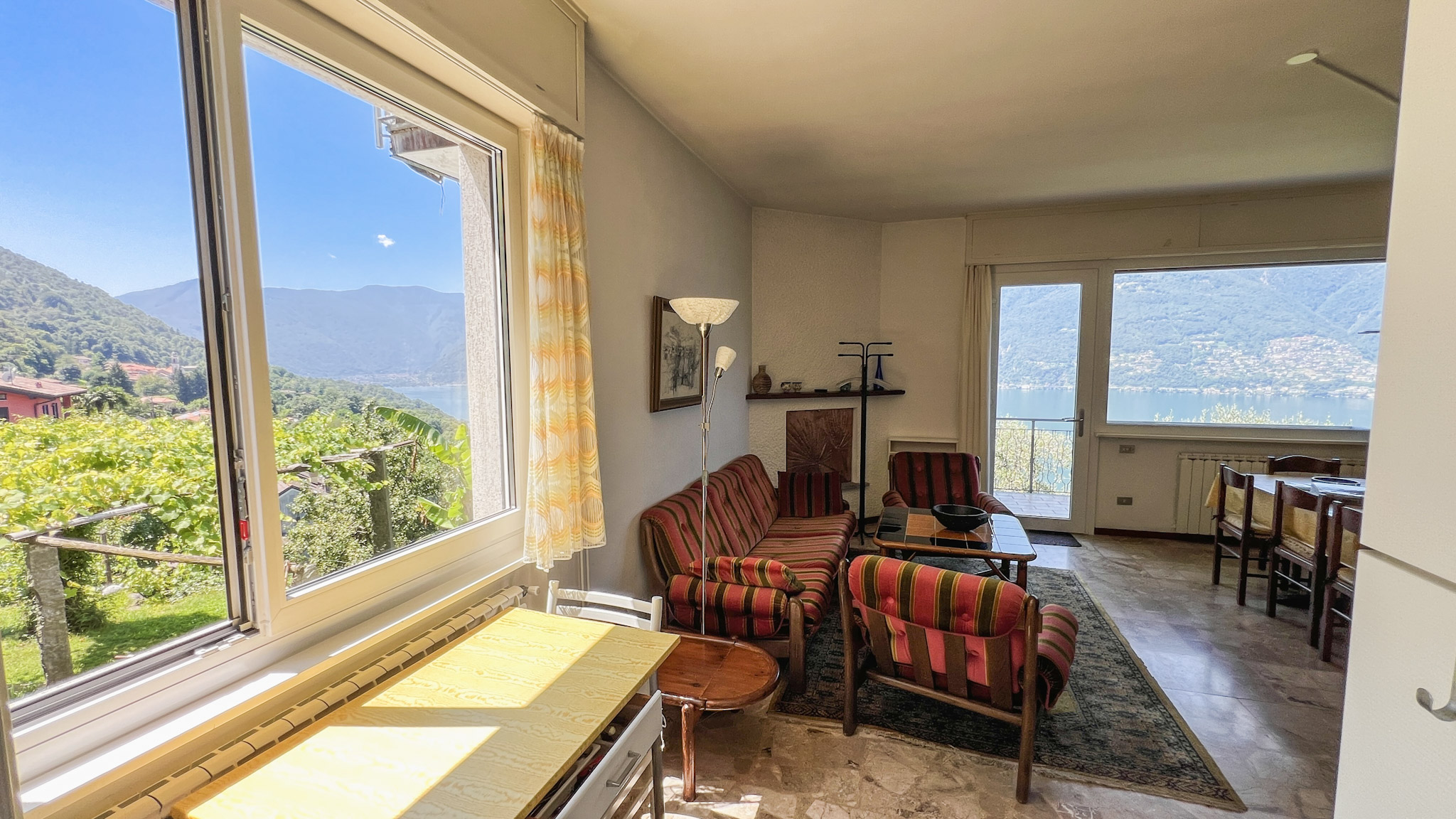 Die ca. 65 m² große 3-Zimmer-Wohnung "Casa Lucertola" befindet sich im 1. Obergeschoss eines freistehenden 2-Familien-Hauses, ca. 2 km oberhalb vom See und vom öffentlichen Strand gelegen. Hier können Sie in ruhiger und ganztags besonnter Lage sowohl vom Innen- als auch vom großzügigen Außenbereich aus eine atemberaubende, freie Panoramasicht auf den See und die umliegenden Berge genießen. Ein Aperitivo in der Abendsonne oder ein Glas Wein bei Sonnenuntergang lässt bei jedem lang ersehnte Urlaubsgefühle aufkommen, das romantische Nachtpanorama auf die beleuchtete Umgebung tut dazu sein Übriges. Von der Wohnung aus haben Sie Zugang zum ca. 3.000 m² großen, gepflegten und schön angelegten Obstgarten (teils in Hanglage), der durch südländische Vegetation geprägt und komplett eingezäunt ist. Im Garten, der Ihnen zur alleinigen Nutzung zur Verfügung steht, befinden sich Weinstöcke, Feigen-, Kaki- und Kirschbäume, Olivenbüsche, Kamelien, Rhododendren etc.. Gartenmöbel wie Tisch, Sonnenschirme, Stühle und Liegen sowie eine Gartendusche sind vorhanden. Ein Pavillon mit eingemauertem Grill und Pergola rundet das äußere Bild ab. Alle Fenster und die Eingangstüre besitzen eine Doppelverglasung mit Panoramascheiben. Ein Restaurant sowie das Lebensmittelgeschäft "Il Negozietto" mit einer großen Auswahl an regionalen Spezialitäten und sind zu Fuß erreichbar Zur Wohnung gehören 2 Autoabstellplätze innerhalb des abgeschlossenen Grundstücks. In der Nähe gibt es vielfältige Möglichkeiten, die schöne Umgebung zu Fuß oder mit dem Fahrrad zu erkunden und dabei die immer wieder wechselnden Ausblicke auf den See und die Berge zu genießen. Für die Wassersportfans gibt es eine Surfschule und Tauchmöglichkeiten in der Nähe. Die obere Wohneinheit wird nur selten vom Vermieter bewohnt, so dass Sie die meiste Zeit das Haus und den Garten allein nutzen können. Das 1. OG erreichen Sie auf Grund der Hanglage über 18 Stufen von der Parkebene aus nach unten, zum Wohnungseingang führen dann wieder 13 Stufen nach oben. Ein Haustier ist erlaubt. Wohnungsaufteilung: