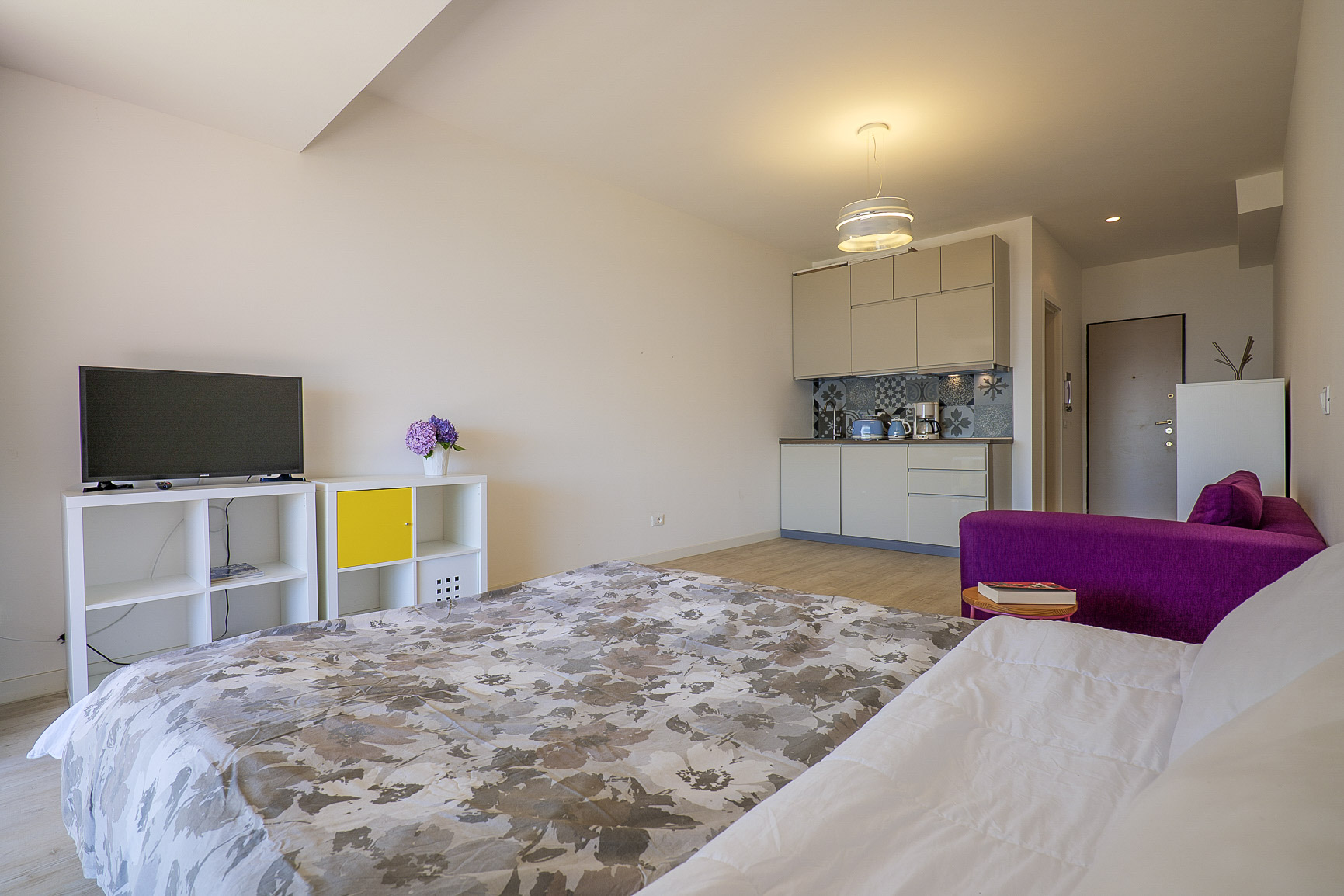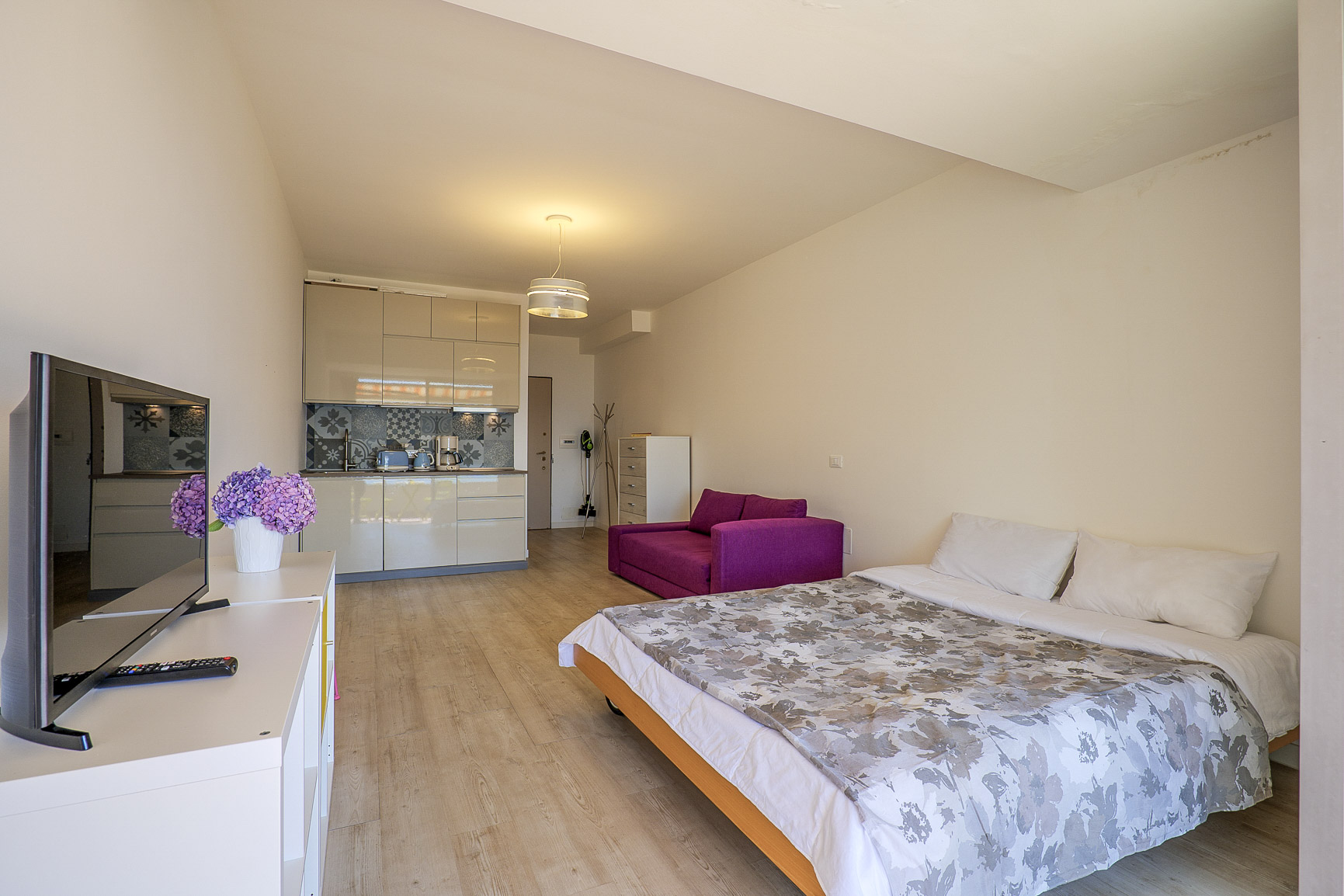 Geschmackvoll möbliertes Studio mit Sonnenbalkon in einer beliebten Residenz mit herrlichem subtropischen Pflanzenbewuchs. Großes Schwimmbad. Tennisplätze. Strandnähe. Ruhige und sonnige Panoramalage. Herrliche Sicht auf den See. Kostenloser WLAN-Internetzugang. Kostenlose Parkplätze in ca. 100 m Entfernung. Bis 2 Personen.