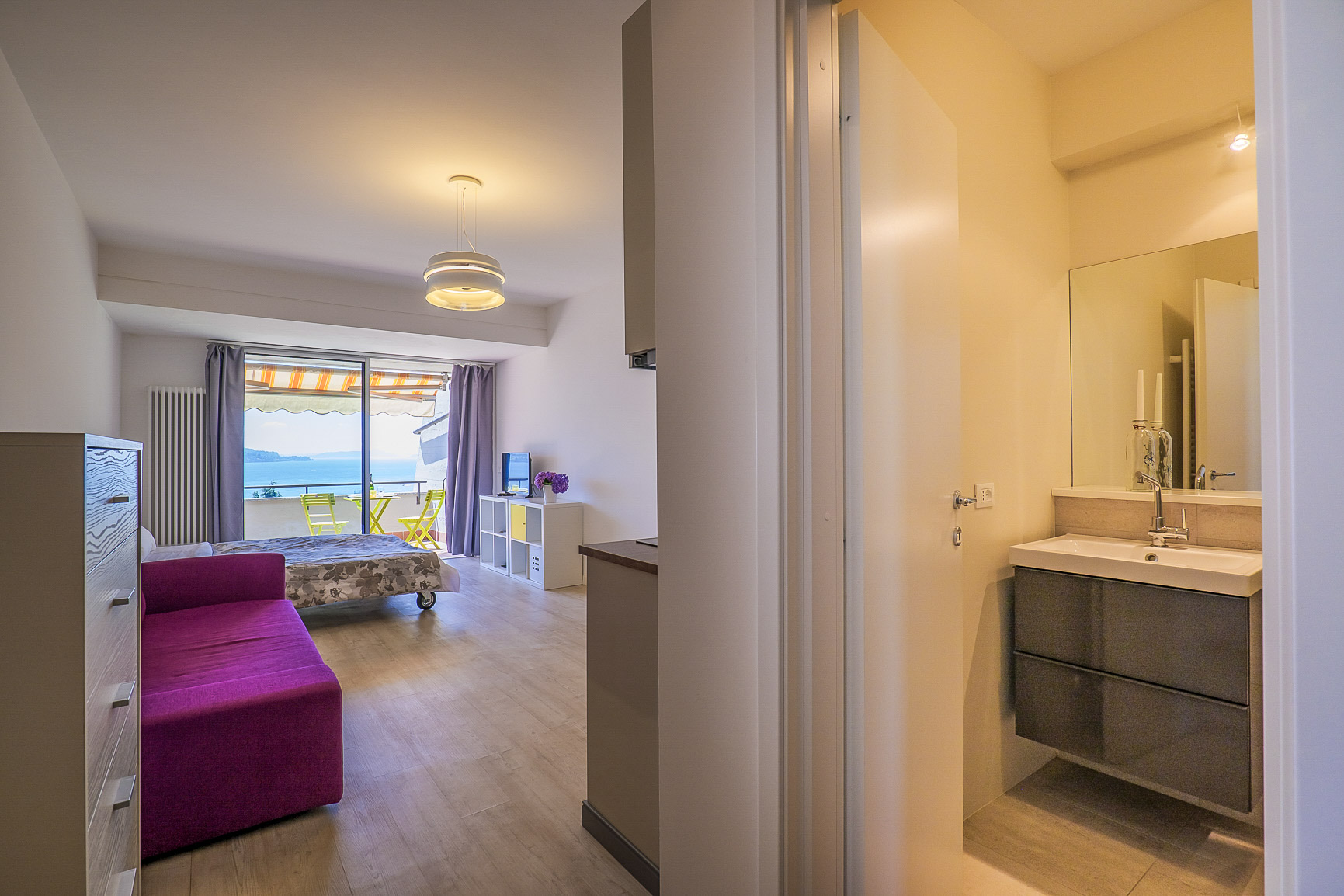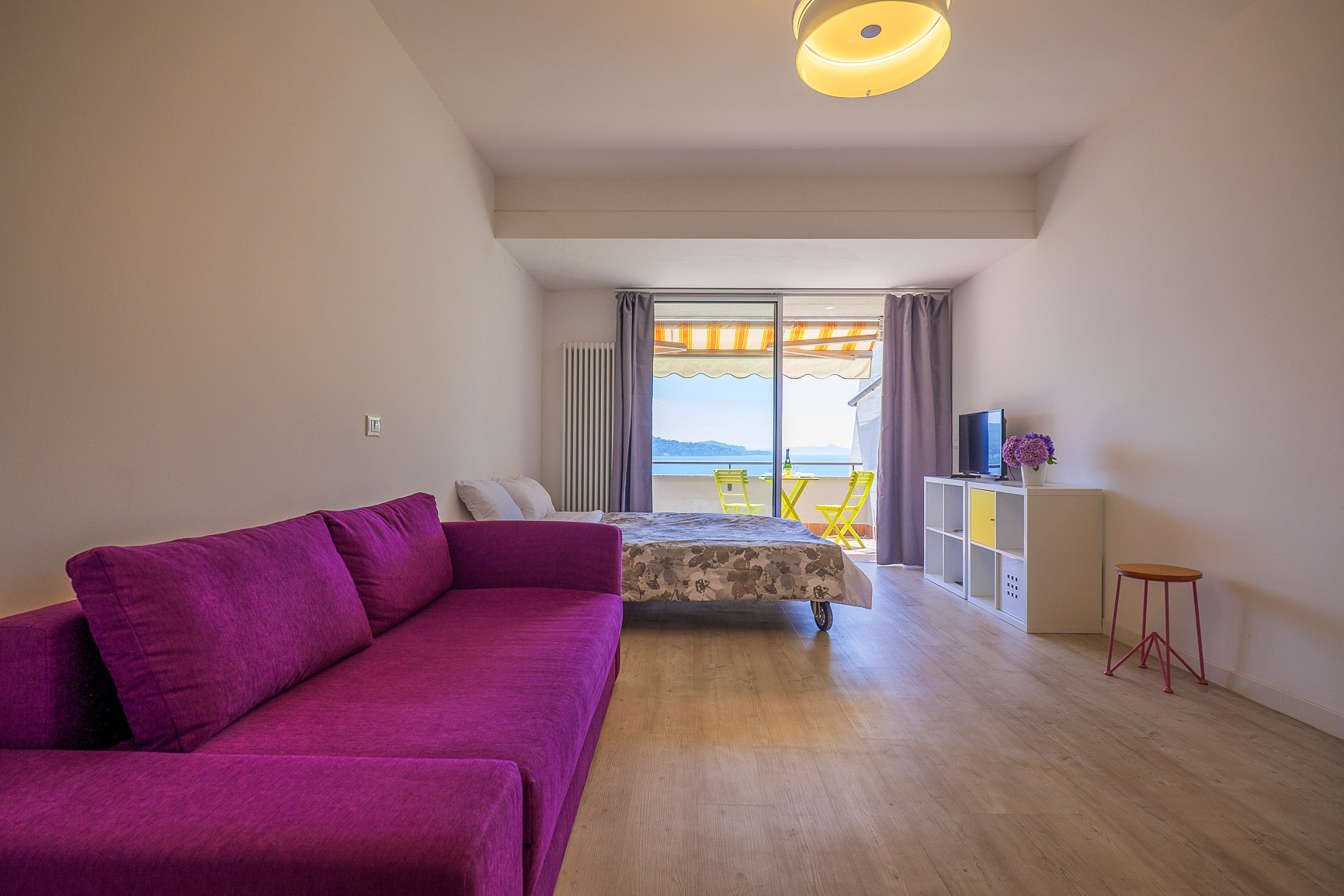 - Großzügiger Wohn-/ Schlafraum mit SAT-TV, ausziehbarem Schlafsofa für 2 Personen (1,60 m x 1,90 m), großen bodentiefen Panoramaschiebetüren, Ausgang auf den Balkon sowie herrlicher Sicht auf den See